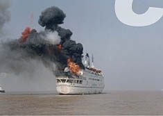 九時三十四分,“恐怖分子”驚慌從“東海一號”輪沿繩索滑下,乘快艇逃逸,兩分鐘后遇難船上便傳來兩聲巨響、火光沖天,“恐怖分子”用遙控器引爆了“東海一號”輪,剎那間,海面上濃煙滾滾--而此時,水上交通管制系統(tǒng)的雷達已經(jīng)鎖定了“恐怖分子”逃逸的快艇。九時四十一分,三艘海警船在控制中心的引導(dǎo)下迅速追擊攔截、擒獲所有“恐怖分子”。
