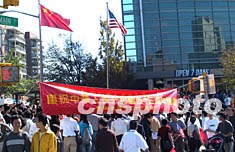 當(dāng)?shù)貢r(shí)間九月二十九日中午,在熱鬧的紐約法拉盛緬街上,飄揚(yáng)起一面五星紅旗。紐約華人今天在此舉行升旗儀式,慶祝中華人民共和國成立五十三周年。作者:趙海燕