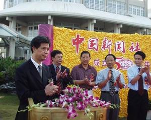 中新社總編輯郭招金在慶典上致辭。他說(shuō),中新社是中國(guó)兩家通訊社之一,成立于一九五二年九月十四日,主要為港澳同胞、臺(tái)灣同胞、華人華僑服務(wù)。目前,中新社在中國(guó)內(nèi)地的二十五個(gè)省、自治區(qū)、直轄市設(shè)有五十六個(gè)分社、支社、記者站。在香港、澳門特別行政區(qū),在美國(guó)、澳大利亞、日本、法國(guó)、泰國(guó)建有分支機(jī)構(gòu),F(xiàn)在中新社每天播發(fā)新聞電訊稿一百余條,傳真圖片三十多張,中國(guó)新聞網(wǎng)每天更新新聞四五百條,中國(guó)新聞圖片網(wǎng)每天更新新聞圖片一百多幅,向海外幾十家報(bào)紙?zhí)峁⿲8搴椭谱魇邆(gè)報(bào)紙版面。