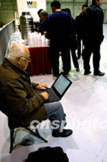 22日,一名美國記者在芝加哥奧黑爾機場休息室里,搶發(fā)中國國家主席江澤民訪問美國飛抵芝加哥的現(xiàn)場新聞。作者:王瑤