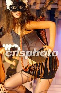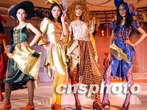2002年中國義烏國際小商品博覽會二十三日在浙江義烏市舉行,中外客商云集,精品薈萃。中國著名襪業(yè)品牌“夢娜”有限公司在博覽會上推出中國首場腿部時裝秀,圖為戴面具的模特展示精美襪裝。作者:錢興強(qiáng)