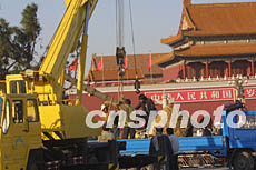 為迎接“十六大”的召開(kāi),天安門(mén)廣場(chǎng)上的園林工人再次為擺花而忙碌。二十八日,耐寒的松樹(shù)被吊車(chē)運(yùn)抵廣場(chǎng),大批鮮花將再現(xiàn)繁花似錦的景觀。作者:史利