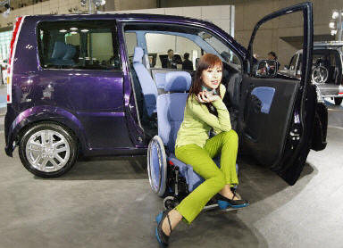 10月29日,在東京汽車展覽會新聞預(yù)展會上,模特展示新型概念車。圖為一款為方便輪椅上下車設(shè)計的新型車。