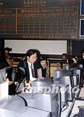 上海黃金交易所三十日正式開業(yè),標(biāo)志著中國(guó)長(zhǎng)達(dá)半個(gè)世紀(jì)的黃金管制徹底結(jié)束,亦表明中國(guó)由貨幣市場(chǎng)、證券市場(chǎng)、保險(xiǎn)市場(chǎng)、外匯市場(chǎng)和黃金市場(chǎng)所組成的主要金融產(chǎn)品交易市場(chǎng)全部建成。圖為上海黃金交易所交易大廳。作者:姜煜
