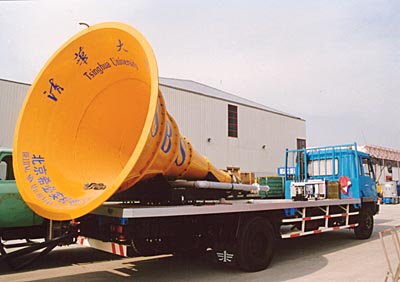 它是高技術(shù)的產(chǎn)品--氣動喇叭。中國的這種氣動喇叭是世界水平最高的。它能讓12公里外的聽眾清楚地聽到廣播,它巨大的功率使它播音時根本沒有人敢站在喇叭前。它是作為世界唯一的機場消霧喇叭的身份來參加航展的。據(jù)介紹它只要吼叫起來,甚至機場跑道上的霧都會消散。