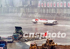 “金山4號”駛出導流明渠入口,頓時五彩氣球放飛起來,正在截流的施工車和“金山4號”都拉響了汽笛,聲震峽江兩岸,有著5年航運史的三峽導流明渠從此永遠封航。截流后,將在它上面崛起三峽工程的右岸大壩。