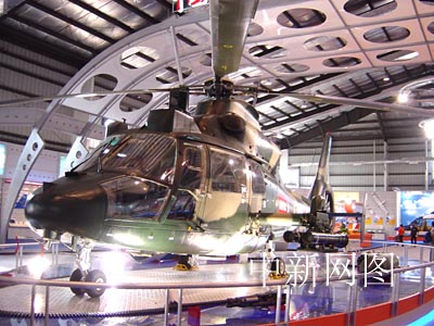 航空二集團(tuán)的其展區(qū)突出位置展示一架國產(chǎn)直-9武裝直升機.