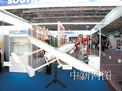 與上屆航展相比,南非的展臺(tái)此次增大了許多,但展品還是一樣,白色的是南非生產(chǎn)的無人機(jī)。
