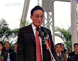 圖:國務(wù)院副總理吳邦國宣布截流儀式開始