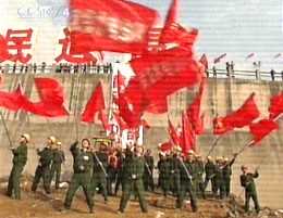 圖:截流成功現(xiàn)場工程人員在圍堰上揮舞紅旗慶賀