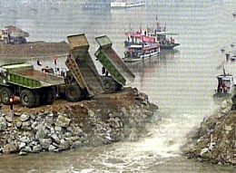 9時(shí)48分,自卸卡車向三峽導(dǎo)流明渠龍口傾倒了最后一批石料,滔滔江水被阻住去路。長(zhǎng)江水全部改由北岸大壩底部的導(dǎo)流洞流往下游。