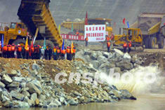 長江三峽工程導(dǎo)流明渠截流,六日上午在國務(wù)院副總理吳邦國一聲令下開始合龍。作者:宋吉河
