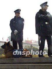 十一月六日,在中共十六大代表陸續(xù)抵達(dá)北京時,北京天安門通過地下通道進(jìn)入廣場的人員都需通過警犬檢查。作者:廖文靜