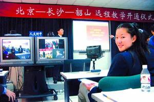 中新網(wǎng)11月7日電 昨天下午,“北京—長(zhǎng)沙—韶山遠(yuǎn)程教學(xué)直通車”正式開(kāi)通。北京人大附中、湖南長(zhǎng)沙一中和韶山學(xué)校高二的幾十名同學(xué)在各自的遠(yuǎn)程教室上了一堂別開(kāi)生面的課。這是我國(guó)首次實(shí)現(xiàn)跨省區(qū)實(shí)時(shí)交互式的遠(yuǎn)程教學(xué)。