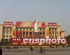 四川省會(huì)成都盛裝喜慶中共“十六大”召開,鮮花簇?fù)碓谔旄畯V場毛澤東像前。作者:肖龍聯(lián)
