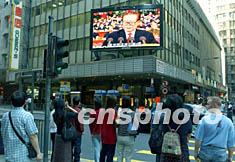 中共十六大11月8日在北京開(kāi)幕,香港有線電視臺(tái)全程直播。中共中央總書(shū)記江澤民作報(bào)告時(shí),正值香港金融心臟中環(huán)一帶緊張的上班時(shí)間,但仍然有不少市民駐足觀看。任晨鳴 攝