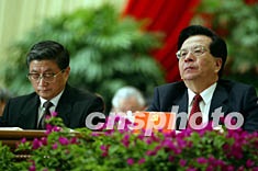 曾慶紅(右)八日在北京中共十六大的主席臺上出席開幕式。作者:毛建軍