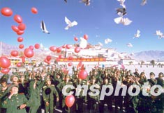 武警西藏總隊(duì)官兵在拉薩布達(dá)拉宮廣場(chǎng)打起威風(fēng)鑼鼓,放飛和平鴿和紅汽球,熱烈慶祝中共十六大召開。作者:趙艷志