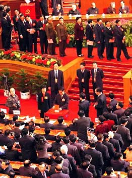 江澤民、李鵬、朱镕基、李瑞環(huán)、胡錦濤、尉健行、李嵐清已相繼在位于主席臺正中的票箱投票。同時,代表和特邀代表們也開始投票。