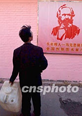 北京的一名勞動(dòng)者被小街邊紅色馬克思畫像所吸引。日前閉幕的中共十六大宣布堅(jiān)持馬克思主義,這位大胡子的無產(chǎn)階級(jí)革命導(dǎo)師依然是世界最大政黨的偶像。作者:賈國(guó)榮