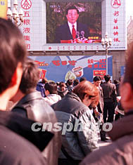 十一月十五日,新一屆中共中央政治局常委通過電視直播與民眾見面。北京火車站廣場的大屏幕前站滿了觀看直播的市民,胡錦濤出任總書記成為關(guān)注焦點。作者:張宇