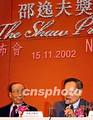 每項獎金為一百萬美元的“邵逸夫獎”十一月十五日在香港設(shè)立,該獎目前有天文學、數(shù)學科學、生命科學三個獎項,每年頒發(fā)一次,預計二零零四年年中舉行首屆頒獎。圖為該獎評審會主席楊振寧(右)與邵逸夫出席香港“邵逸夫獎新聞發(fā)布會”。潘索菲 攝