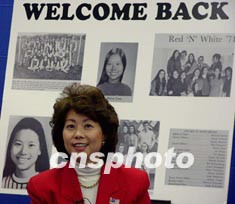 美國(guó)勞工部部長(zhǎng)趙小蘭二十二日下午回到她的母校紐約賽奧斯特(Syosset)高中。一九七一年,她從這里畢業(yè)。二○○一年,她成為美國(guó)歷史上首位亞裔內(nèi)閣成員。為歡迎趙小蘭到來(lái),該校師生特別制作了“歡迎歸來(lái)”的展板。作者:陳建