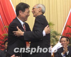 中華全國工商業(yè)聯(lián)合會九屆一次執(zhí)委會完成了新老主席的交替工作。二十七日,在北京京西賓館舉行的全國工商聯(lián)第九次會員代表大會閉幕式上,新當(dāng)選的黃孟復(fù)主席(左)與原主席經(jīng)叔平(右)在熱烈的掌聲中緊緊擁抱。作者:史利