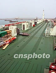 在二層寬闊宛如“小型航空母艦”的汽車甲板上,記者同樣看到了設(shè)計(jì)周密的捆綁裝置:那是一道道如履帶印的防滑道,加上一些十字槽口“地令”。一種汽動(dòng)式捆綁裝置,一頭固定在汽車上,一頭卡在地令槽中,然后充氣拉緊捆綁,確保汽車在船舶十五度傾斜中無恙。