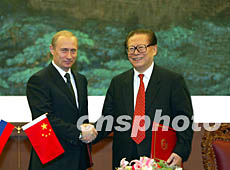 2000年7月,普京總統(tǒng)首次訪華。江主席向普京總統(tǒng)提出,為了確保中俄兩國和兩國人民世代友好、永不為敵,我愿與你共同簽署一個確定雙邊關(guān)系長期發(fā)展原則與方向的《中俄睦鄰友好合作條約》。普京總統(tǒng)對此積極響應(yīng)。根據(jù)兩國元首的指示,雙方外交部門很快就條約文本達成一致。條約由兩國元首在江主席2001年7月訪俄時順利簽署。