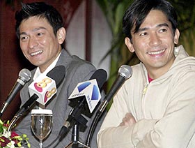 據(jù)聯(lián)合晚報報道,兩人前天到新加坡為《無間道》作宣傳,在記者會上,互相自己給自己戴高帽,還拼命給對方戴高帽,惹出不少笑話。