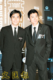 據(jù)港報報道,幾位主角劉德華﹑梁朝偉﹑陳冠希﹑黃秋生及余文樂等,都穿黑色服裝出席,而到場的唯一一位女演員蕭亞軒卻穿得十分鮮艷,形成強(qiáng)烈對比。眾演員先在時代廣場的露天廣場舉行祝酒儀式,為見偶像一面,現(xiàn)場早已圍滿了數(shù)百fans,而到場采訪的記者也近百人。當(dāng)劉德華與梁朝偉出場時,fans不停尖叫,兩位男主角更互斗電力,偉仔單眼,華仔則瞇眼,不時做出放電的表情,令現(xiàn)場fans“喧嘩鬼叫”。