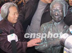 圖為倪翠萍老人在自己的雕像前控訴侵華日軍暴行。