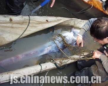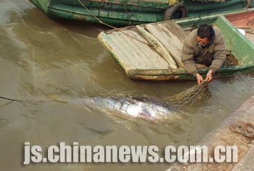 據(jù)介紹,白鱘是漁民孫永來昨天下午二時左右在長江下關(guān)潛洲以北的江面上捕捉到的。孫永來花費(fèi)一個多小時將白鱘拖運(yùn)到一千五百米處的漁政碼頭。