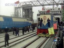 粵海鐵路此次重載聯(lián)調(diào)試驗是從12月11號開始的,首先在瓊州海峽北岸的北港碼頭進行了重載列車的裝船和卸船試驗,取得了圓滿成功。昨天開始,粵海鐵一號火車渡輪裝載著兩列總重超過700噸的鋼軌專列和兩臺重達138噸的機車正式開始跨海航行試驗,經(jīng)過44分鐘的航行,順利抵達南港碼頭。