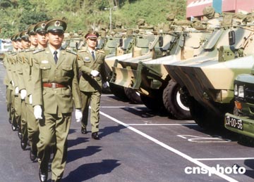 中國人民解放軍駐澳門部隊的裝甲機動分隊軍容嚴整。作者:中新社