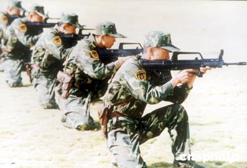 中國人民解放軍駐澳門部隊的官兵在廣東某基地使用國產(chǎn)新式?jīng)_鋒槍大練兵。作者:中新社