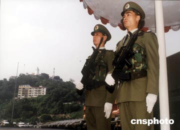 中國人民解放軍駐澳門部隊在古老的松山燈塔下站崗。作者:中新社