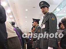 十九日是北京黃金產(chǎn)品正式銷售的第二天,仍有大批市民冒雪前往購買金條。由于人太多,商場(chǎng)保安層層護(hù)衛(wèi)購金隊(duì)伍。作者:王麗南