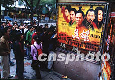 由張藝謀執(zhí)導的武俠巨片《英雄》二十日在福州上映。影片開映前,電影院門口排起了長長的購票隊伍。作者:鄭祚聲