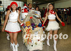 十二月二十日,香港機場購物廊圣誕慶;顒咏议_序幕,圖為身穿美麗服裝的女孩們將圣誕禮品派發(fā)給旅客。潘索菲 攝