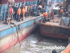 長壽特大海損事故沉船打撈工作目前已進行三天,今天下午四點五十六分,沉船船頭已露出水面。十八日上午七時二十分左右,長江重慶長壽水域發(fā)生特大海損事故,載有三十輛汽車的滾裝船宜盛號與一過江客運輪渡相撞,造成八人死亡,三十二人失蹤。圖為打撈出水面的沉船船頭。雷鳴攝