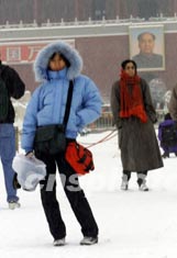 二十三日北京又飄雪花,一名少女全身御寒裝備游覽天安門廣場。作者:滿會喬