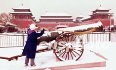 北京連續(xù)六天降雪創(chuàng)下百年紀(jì)錄。二十四日,京城終于雪過(guò)天晴,一位保潔工人正在故宮午門前清掃神威大炮上的積雪。作者:張煒