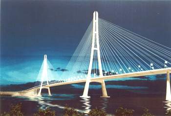該橋全長約十五點(diǎn)六公里,主跨跨徑六百四十八米,設(shè)計(jì)為六車道高速公路。工程投資概算二十九點(diǎn)六億元,工期四年,計(jì)劃于二00六年底建成通車。