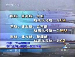 據(jù)中央電視臺(tái)報(bào)道,2003年1月1日起,重組后的國(guó)航、東航、南航三大民航運(yùn)輸集團(tuán)的航班代號(hào)將分別統(tǒng)一為CA、MU和CZ,同時(shí)西南航、中航、西北航、云南航、北方航、新疆航原有代號(hào)將不再使用。統(tǒng)一航班代號(hào)后,三大航空集團(tuán)的飛機(jī)也將分別統(tǒng)一標(biāo)志和名稱,常旅客計(jì)劃也將實(shí)現(xiàn)內(nèi)部統(tǒng)一,擴(kuò)展了常旅客會(huì)員累積里程和兌換獎(jiǎng)勵(lì)的航班范圍。同時(shí)三大運(yùn)輸集團(tuán)還將分別統(tǒng)一航空餐食標(biāo)準(zhǔn)。為了保證航班運(yùn)行正常和平穩(wěn)過渡,三大集團(tuán)近期不會(huì)對(duì)航班計(jì)劃和航線布局做大的調(diào)整。