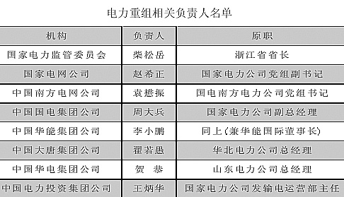 新成立的電力公司包括:國(guó)家電網(wǎng)公司和中國(guó)南方電網(wǎng)有限公司,以及中國(guó)華能集團(tuán)公司、中國(guó)大唐集團(tuán)公司、中國(guó)華電集團(tuán)公司、中國(guó)國(guó)電集團(tuán)公司、中國(guó)電力投資集團(tuán)公司等五家發(fā)電公司,和公司中國(guó)電力工程顧問集團(tuán)公司、中國(guó)水電工程顧問集團(tuán)公司、中國(guó)水利水電建設(shè)集團(tuán)公司和中國(guó)葛洲壩集團(tuán)公司等四家輔業(yè)公司。