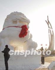 二零零三年長春凈月潭冰雪旅游節(jié)的游樂園準備就緒,大型雪雕作品《雄獅》正在最后修飾,三十六個景區(qū)共有四百九十三件冰雪雕作品。作者:韓丹