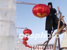 長春凈月潭冰雪旅游節(jié)將于二零零三年元月三日開幕,大紅燈籠高掛在晶瑩剔透的冰雕上。作者:韓丹