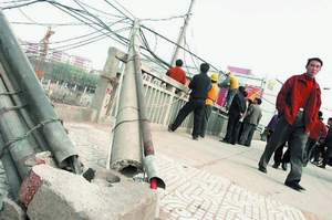 中新網(wǎng)1月3日電 昨天凌晨5時許,一輛加長貨車路過廣州市廣園西路王圣堂與京廣鐵路交匯處時,不慎掛上空中鋪設(shè)的民用電纜,拉斷四根用于架設(shè)電纜的水泥桿,導致近300米電纜垂落在地。因搶修該電纜造成京廣線廣州段中斷一個多小時,其中有一段電纜險些碰上京廣鐵路2.7萬伏鐵路專用高壓電網(wǎng)。